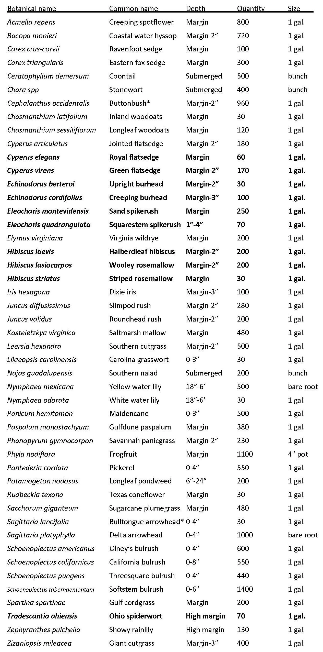 We currently have less than 30 of these species also (1 gallon unless noted). Call for current quantity. Mexican mosquitofern (Azolla microphylla) (in bunches), Watershield (Brasenia schreberi), Texas water canna (Canna glauca), Swamp lily (Crinum americanum), Dwarf spikerush (Eleocharis minima), Mountain spikerush (Eleocharis montana), Neches river mallow (Hibiscus dasycalyx), Torrey’s rush (Juncus torreyi), Floating waterprimrose (Ludwigia peploides), Yellow waterlily (Nymphaea mexicana), Spatterdock (Nuphar lutea), Spring obedient plant (Physostegia intermedia), Marsh fleabane (Pluchea odorata), Giant coneflower (Rudbeckia maxima), Red flag (Thalia geniculata) (native to FL, AL), Common cattail (Typha latifolia).