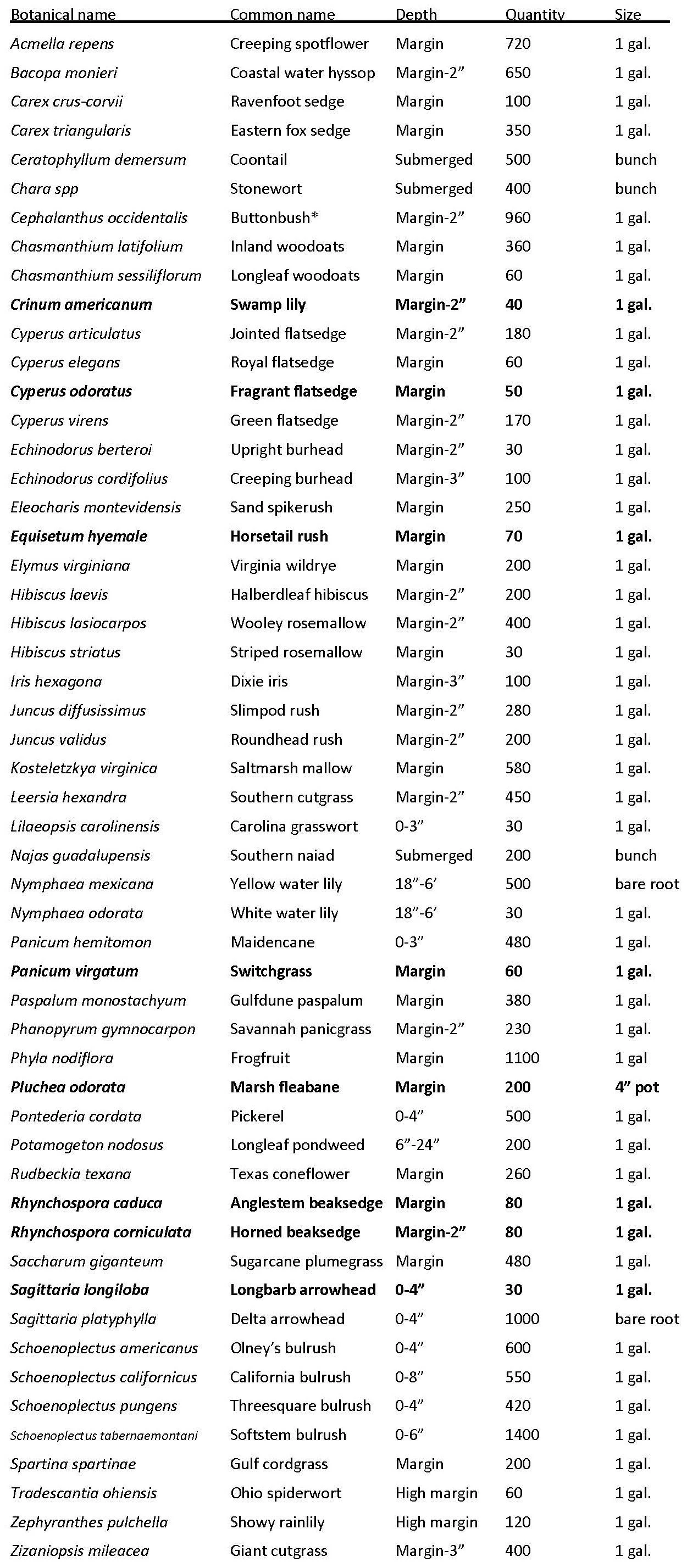We currently have less than 30 of these species also (1 gallon unless noted). Call for current quantity. Mexican mosquitofern (Azolla microphylla) (in bunches), Watershield (Brasenia schreberi), Dwarf spikerush (Eleocharis minima), Mountain spikerush (Eleocharis montana), Neches river mallow (Hibiscus dasycalyx), Torrey’s rush (Juncus torreyi), Floating waterprimrose (Ludwigia peploides, Florida paspalum (Paspalum floridanum), Brownseed paspalum (Paspalum plicatulum), Spring obedient plant (Physostegia intermedia), Marsh fleabane (Pluchea odorata), Red flag (Thalia geniculata) (native to FL, AL), Common cattail (Typha latifolia).
