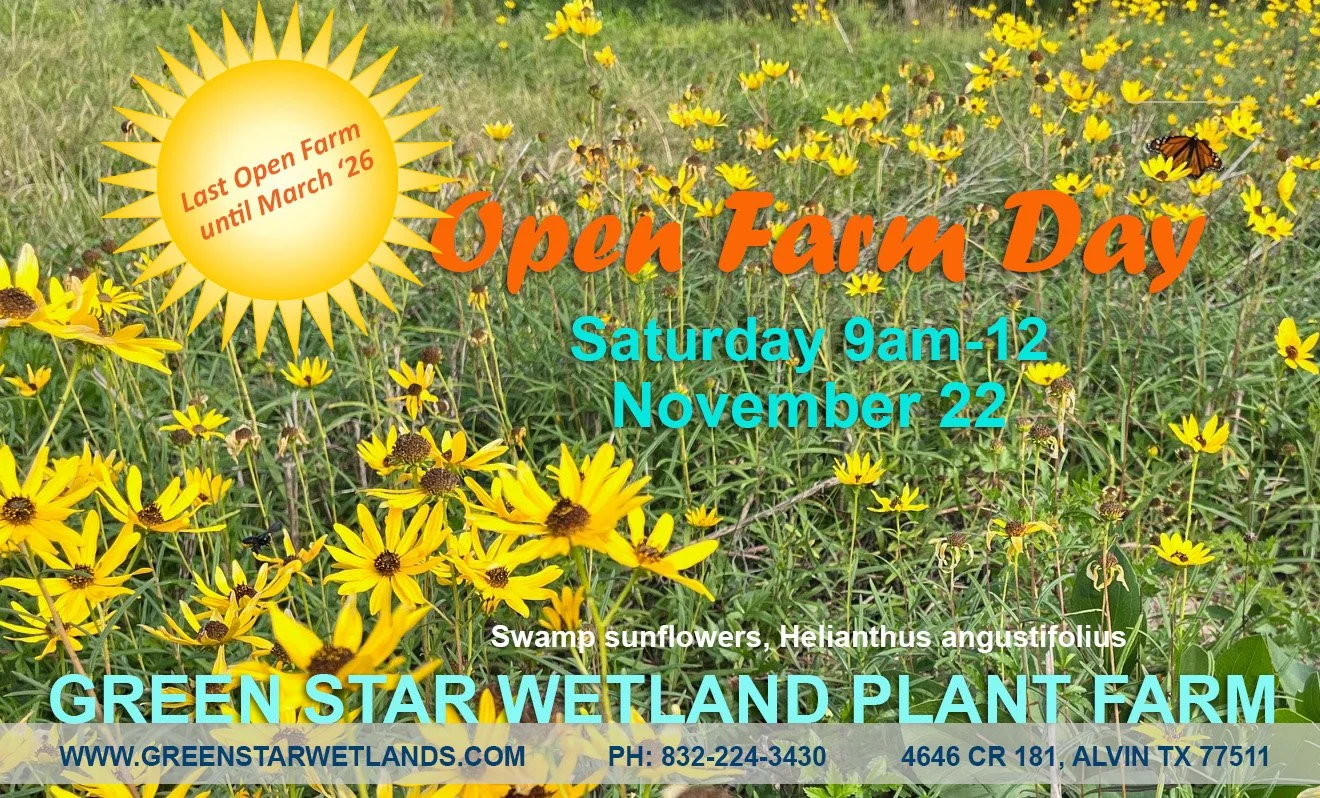 We currently have less than 30 of these species also (1 gallon unless noted). Call for current quantity. Mexican mosquitofern (Azolla microphylla) (in bunches), Lemon bacopa (Bacopa caroliniana), Watershield (Brasenia schreberi), Dwarf spikerush (Eleocharis minima), Mountain spikerush (Eleocharis montana), Neches river mallow (Hibiscus dasycalyx), Zigzag iris (Iris brevicaulis), Torrey’s rush (Juncus torreyi), Floating waterprimrose (Ludwigia peploides), Mexican waterprimrose (Ludwigia octovalvis), Hairy waterclover (Marsilea vestita), Spatterdock (Nuphar lutea), Spring obedient plant (Physostegia intermedia), Swamp smartweed (Polygonum hydropiperoides), Longbarb arrowhead (Sagittaria longiloba), Black willow (Salix nigra) Humped bladderwort, bare root (Utricularia gibba).
